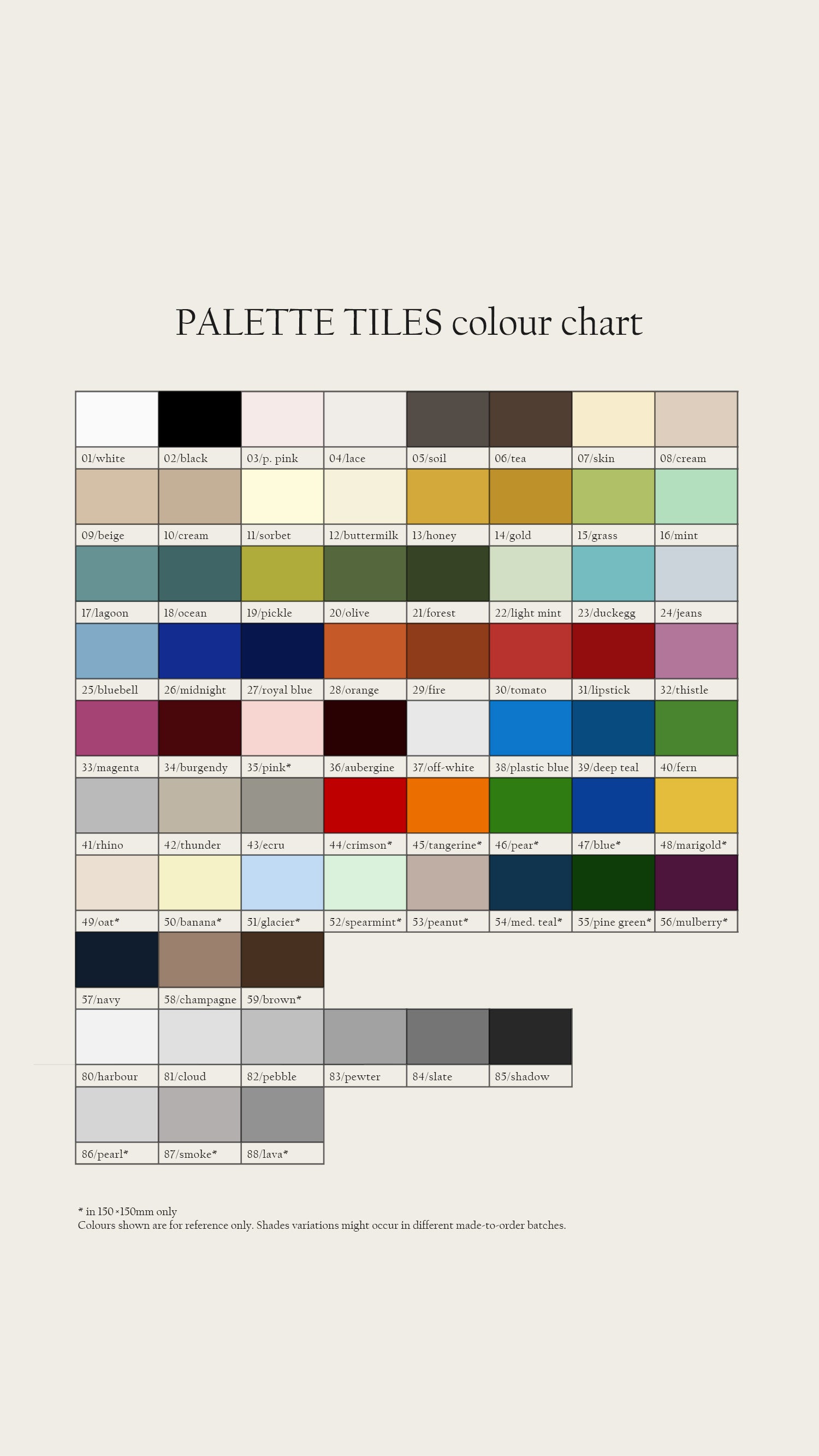 Palette tile range consists of 70+ colours, available in 10x10cm and 15x15cm square format per tile.