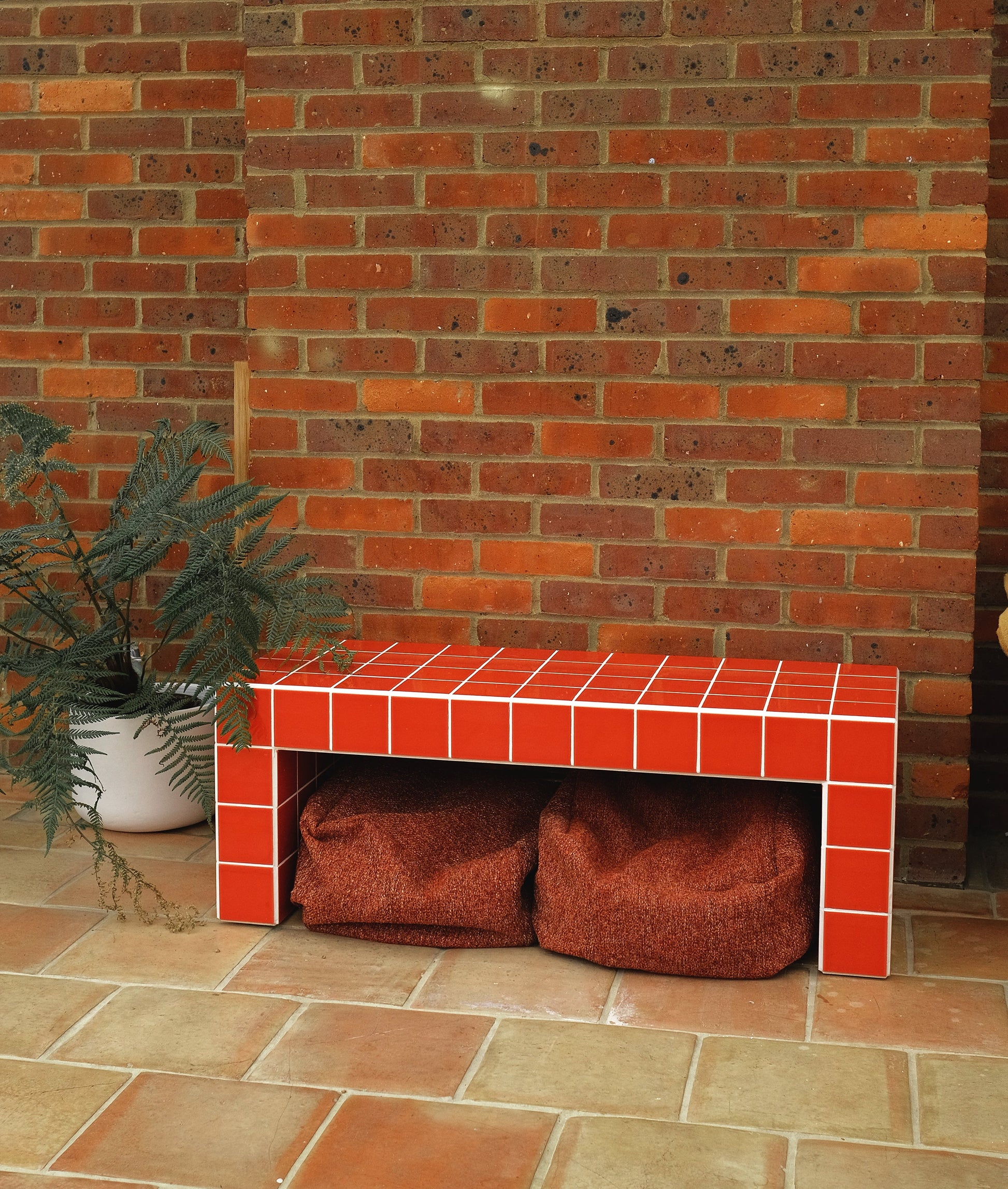 Waterfall bench crafted from our 100×100mm PALETTE tile, can be styled it as a bed-end console, doorway bench or living room side table. Comes in a variety of tiles & grout colours.