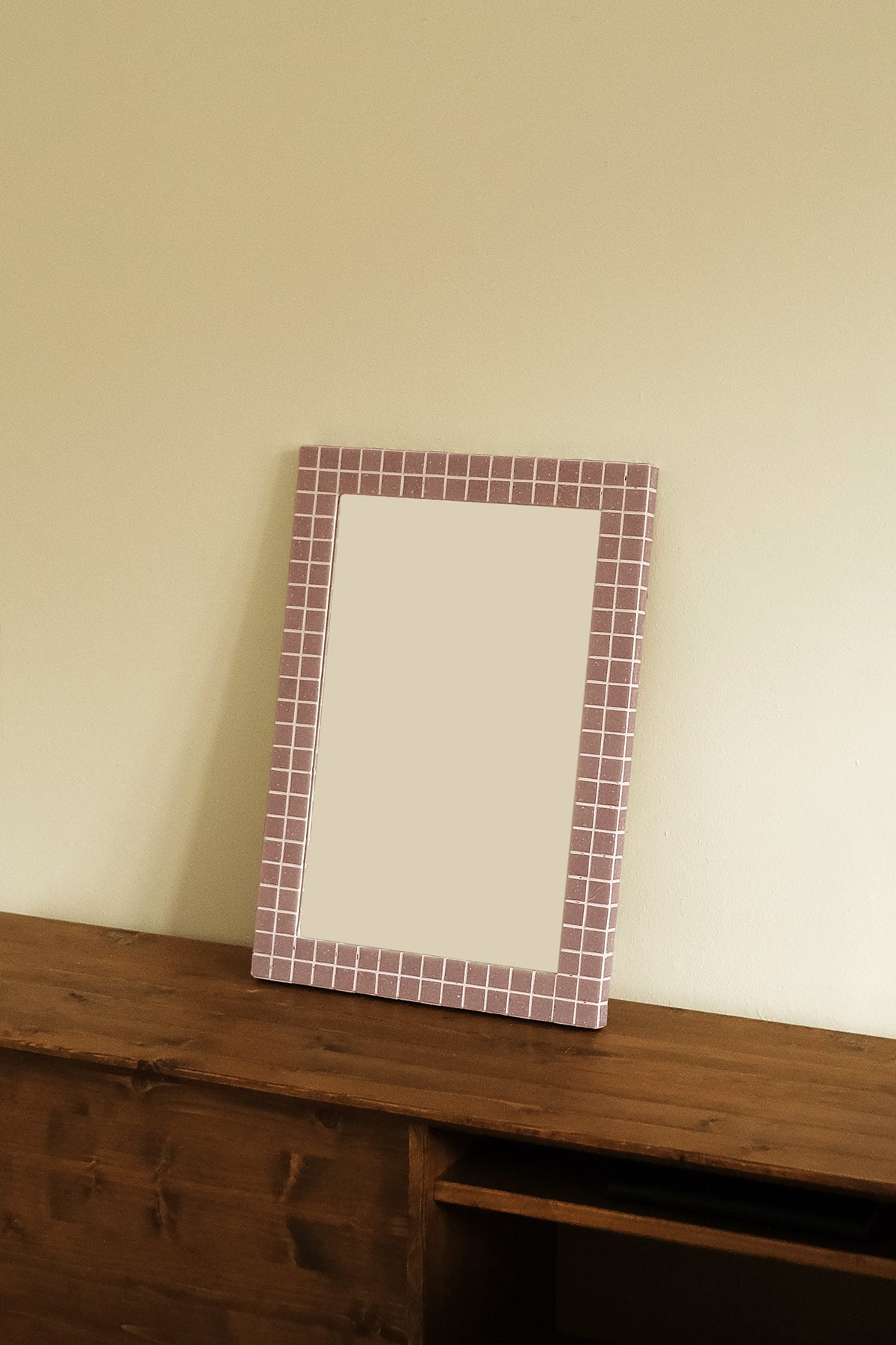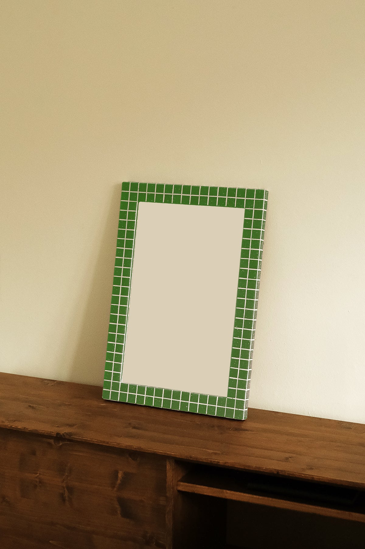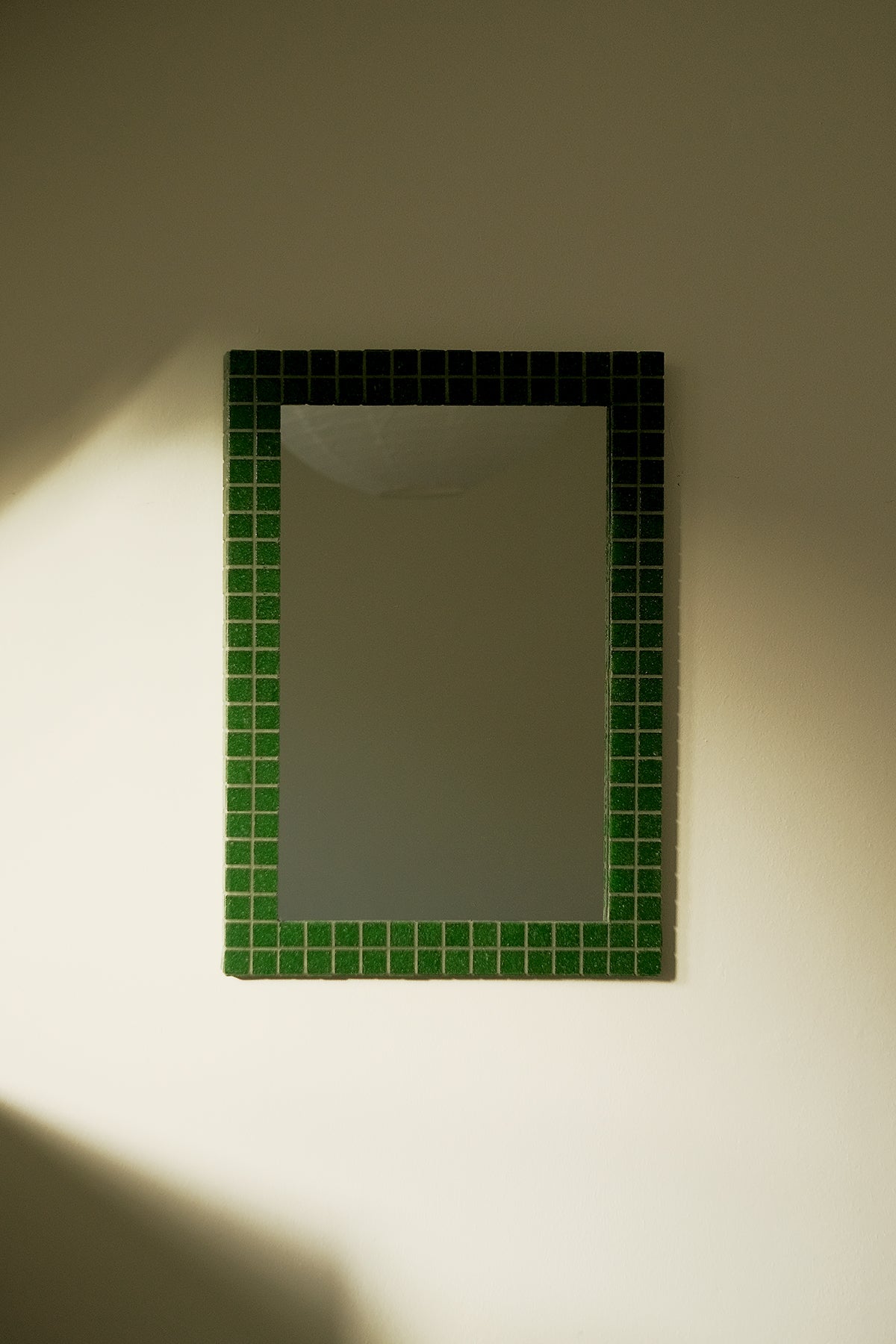 Handcrafted rectangular wall mirror featuring a fired glass mosaic frame, up-cycled from manufacturer’s surplus. Available in green, grape, toffee and grey .